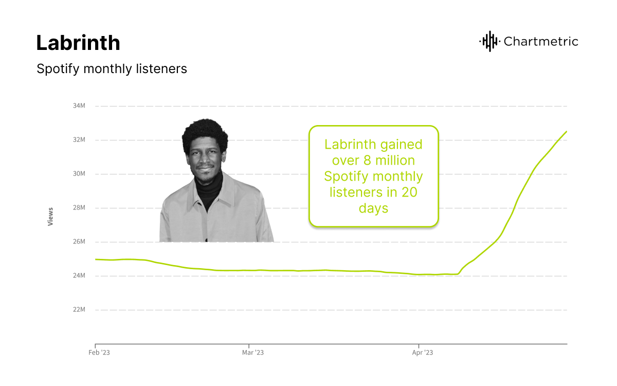 It’s also worth noting that Labrinth released the single, “Never Felt So Alone,” on April 7th, acting as an initial push to generate listening engagement. Since the single’s release, Labrinth has gained over 8 million Spotify monthly listeners.