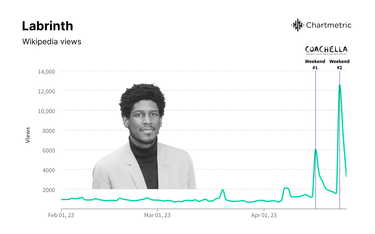This year, our most significant increase in raw Spotify monthly listeners belonged to British singer, rapper, and producer Labrinth. He was joined on stage by Billie Eilish during week one of the festival, generating a buzz and garnering 6K Wikipedia views in the last day of the festival’s first weekend. As week two rolled around, Labrinth raised the bar even higher and brought out Euphoria star Zendaya for a duet of the show’s “All Of Us.” This drove over 12K users to visit Labrinth’s Wikipedia page in just one day, demonstrating the singer’s overall ability to tap into different fandoms and artist fanbases.