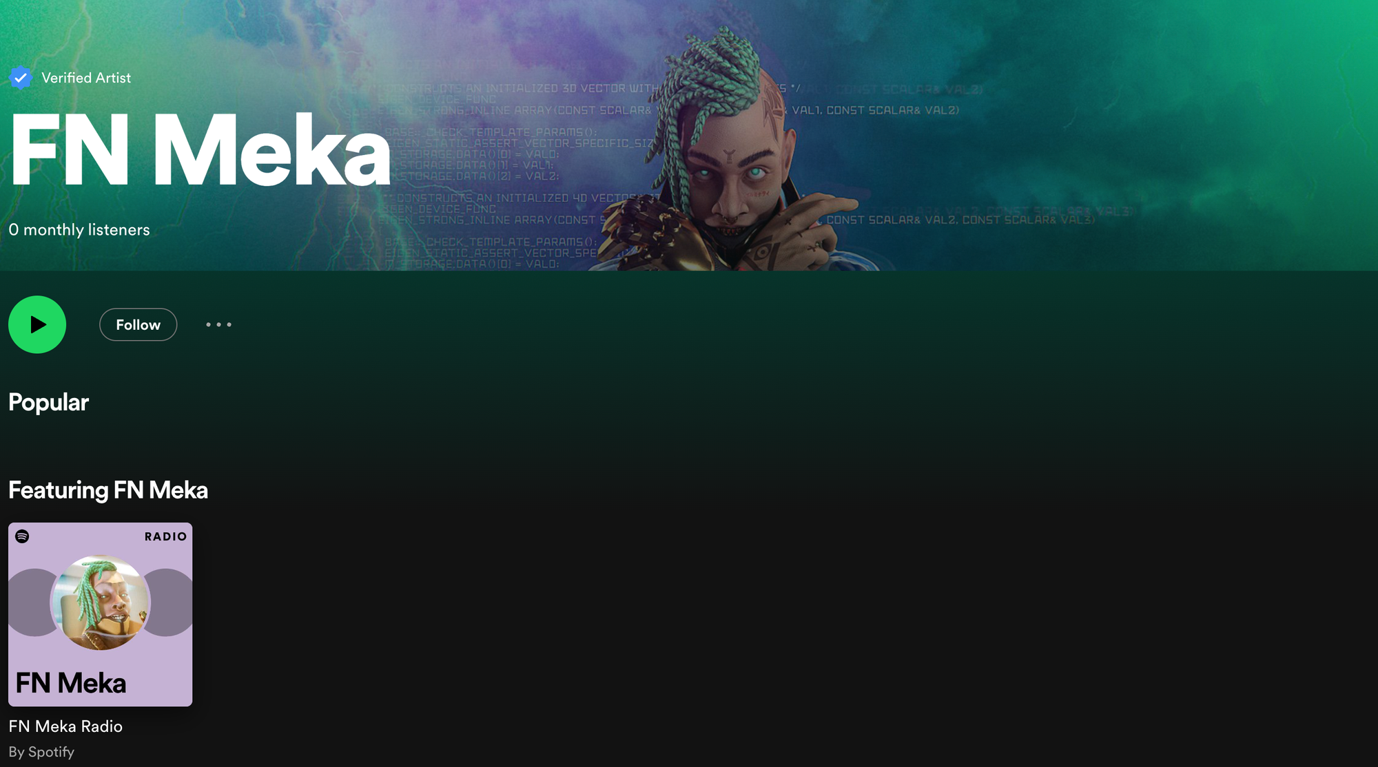 Despite continued adds onto playlists, none of the songs on FN Meka’s Spotify profile are currently streamable, putting FN Meka’s monthly listenership at zero. This kind of activity on fake artist accounts is not only bizarre, it also stands in stark contrast to the real artists trying to make a living creating music from scratch to be consciously heard and enjoyed.