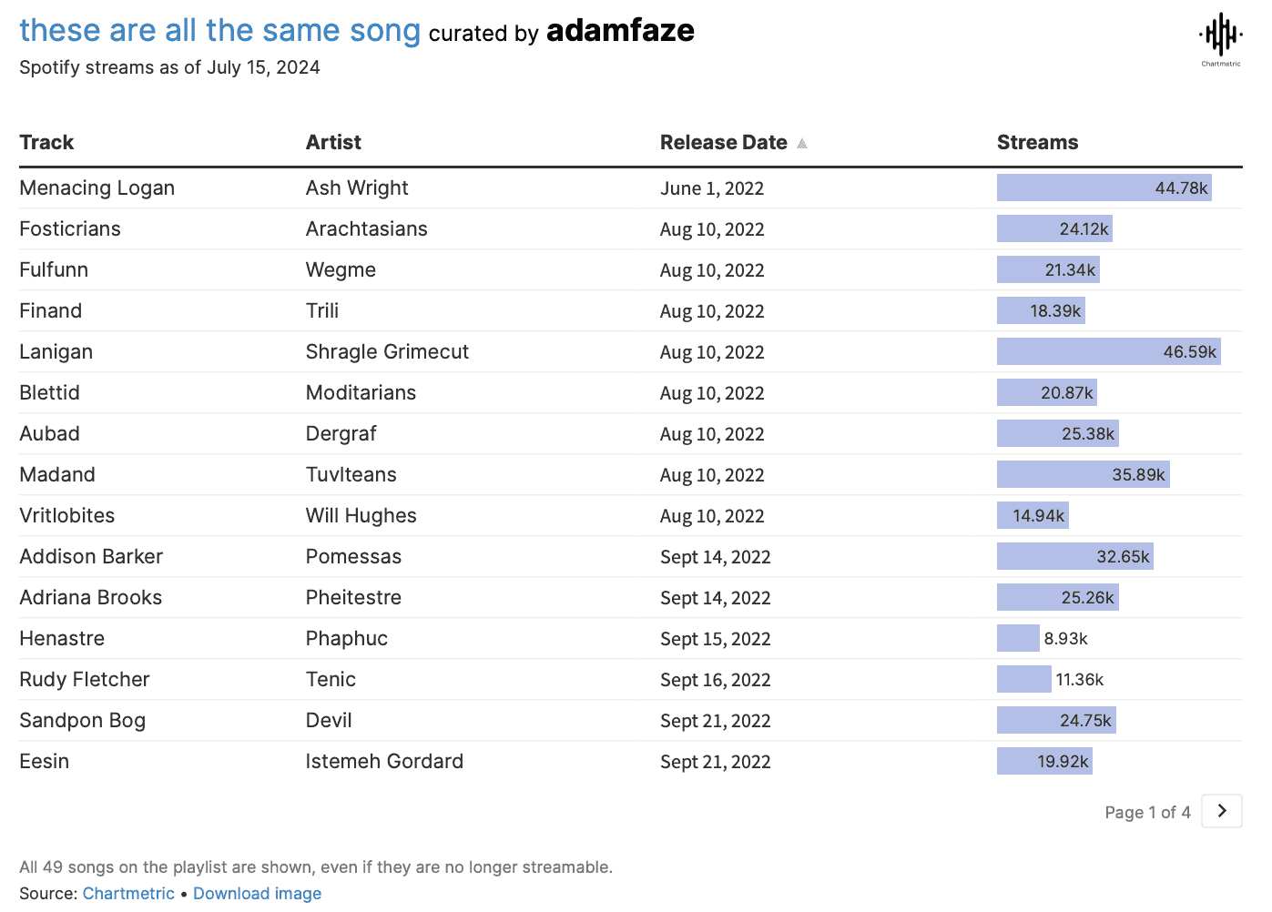 Gioia goes on to describe how as AI music continues to flood music platforms, we are seeing an oversaturation of music that sounds eerily similar. He gives an example from Spotify user adamfaze, who has compiled a playlist of AI-generated music called these are all the same song, featuring 49 songs that all sound basically identical.