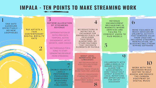 When it comes to business models, IMPALA believes that “there is no single model that would provide an instant fix to more fairly distribute revenue” and therefore recommends “a spectrum of ideas to investigate and implement as appropriate.”
