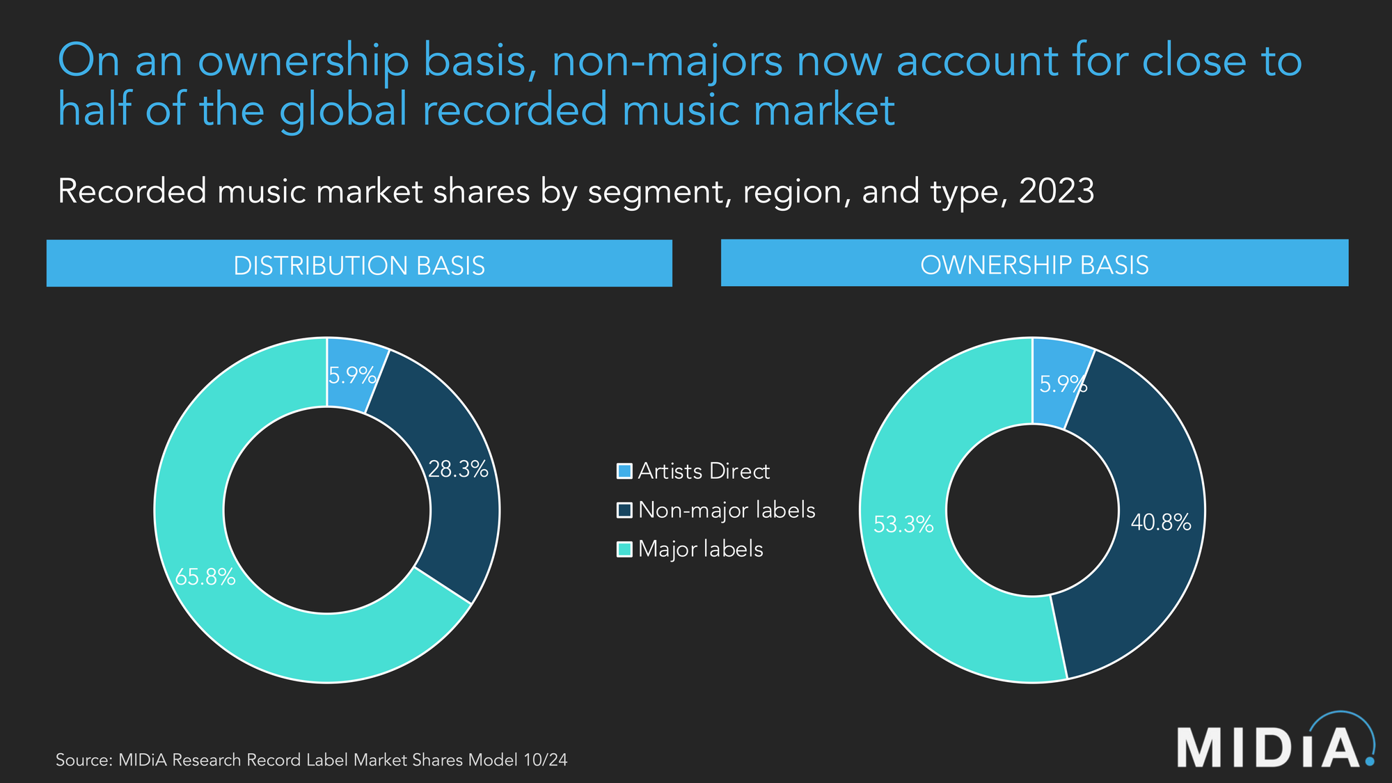 Despite all of the challenges they face, non-majors (labels and artists direct i.e., self-releasing artists) are growing their share of the total market, on both an ownership and a distribution basis. Non-majors, on a distribution basis, represented 34.2% of the total recorded music market in 2023, but on an ownership basis this jumped to 46.7%, with revenues of $14.3 billion. Non-major revenue distributed by the majors was $3.8 billion in 2023. The major labels are major players (pun intended) in the non-major market. They have successfully learned how to turn growing non-major share to their advantage.