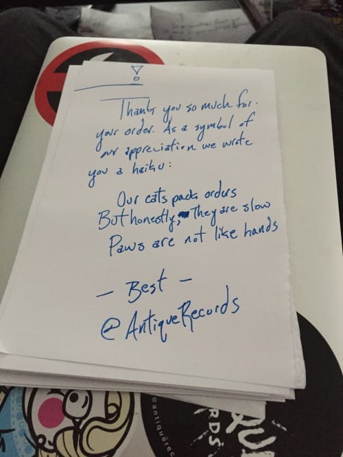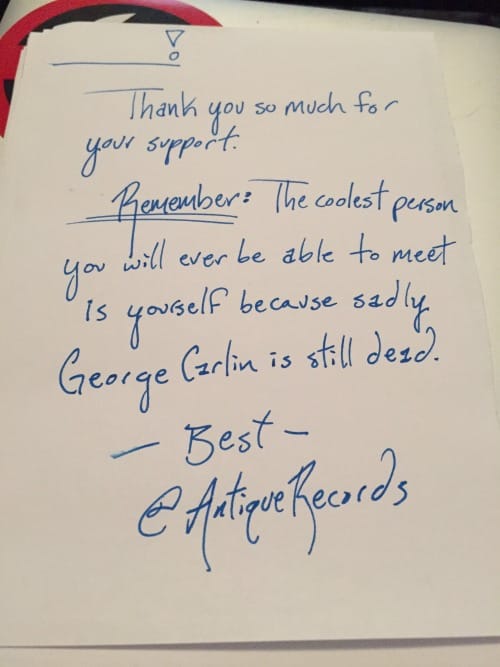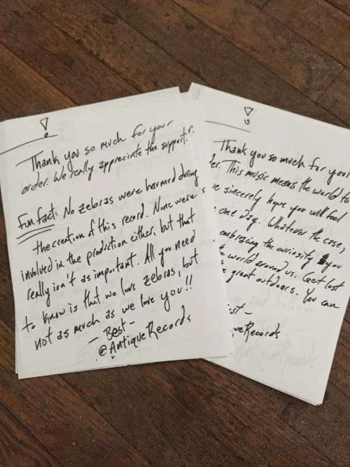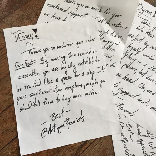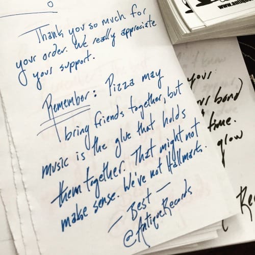 I’ve been running my own record label for the better part of three years at this point, and along the way I’ve learned countless lessons I wish I had known prior to launch. That’s just the way life works sometimes, I guess. You can plan and study all you want for something, but eventually you will find there are numerous paths to success you never even considered. The best you can do is learn as you go along and pass whatever knowledge you gain to those who have yet to begin. Share what you have learned so that others will not only have a leg up on their own journeys, but so that you can better understand the information yourself. That is what I hope to accomplish with this series, and every few weeks I will share a new lesson learned during my adventures in the world of small business ownership.One of the reasons I always loved supporting indie artists and labels as a teen was because anyone I ordered from online always seemed incredibly appreciative of my business. I cannot think of a single time I ordered something online from an artist or label and did not receive something extra when the package eventually arrived in my inbox. It may have been something small, like a sampler CD or free stickers, but to me it showed that I mattered to the people from whom I had ordered. They could have given me what I paid for, but instead they went out of there way to give me something extra, and through doing so they forged a connection with me that more than likely continues to this day.What I didn’t consider when I was younger was the cost associated with these freebies. Running a business is rarely a cheap adventure, and that goes double for any attempt at building your own empire within the world of music. Stickers and sampler CDs cost money, even if you burn the CDs from iTunes playlists on your own laptop it’s going to cost something, and that amount will add up as the number of orders received begin to grow. Before you know it, you could be in debt not because your products aren’t selling, but because you’ve given away just as much as, if not more than you’ve sold.For now, the main way my label attempts to engage with consumers beyond simply fulfilling orders is by creating unique, handwritten ‘thank you’ letters. These are short notes written by either myself or own of my team members that, with slight variation, thank the consumer for their purchase and offer some kind of advice, anecdote, fact, or thought aimed at making them smile. Sometimes that means offering exclusive discounts, while other times that may entail promising pizza to overseas fans if they ever make it to the place where you’re located. You know the chances of that last one coming true are probably slim to non-existent, but like any greeting/thank you card ever sent it’s the though that counts, and offering your fans free pizza is one heck of a gesture to make.Here are a few examples of letters we have created: