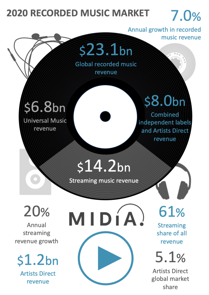 The major record labels saw collective market share fall from 66.5% in 2019 to 65.5% in 2020. While this shift is part of a long-term market dynamic, most of the dip was down to WMG reporting flat revenues for the year. SME gained share and UMG remained the largest record label with 29.2% market share. Independent labels also saw a 0.1 point drop in market share, but there was a very mixed story for independents. MIDiA fielded a global survey of independent labels and the data from that helped us track the contribution of independents. Independent labels as a whole grew by 6.7% (i.e. slightly below the market), but within the sector there was a massive diversity of growth rates, with smaller, newer indies tending to grow faster than the market (some dramatically so) and larger, more established indies growing below the market rate. There were also many independents (of all sizes) that saw revenues fall in 2020.