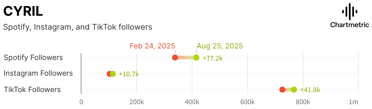 CYRIL continues to maintain strong momentum after the release. Over the past 6 months, he gained over 77K followers on Spotify, reaching a new peak of 416.2k. His social media presence also grew steadily, with Instagram followers increasing by 10.7K, and his TikTok followers surging by 42.6K, both marking his highest count to date.