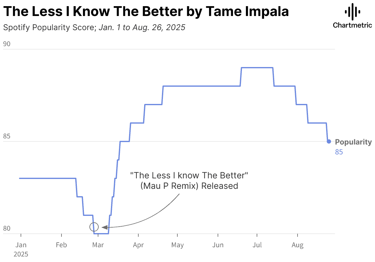 In February 2025, Mau P’s remix of Tame Impala’s (CM rank: 281) iconic hit “The Less I Know The Better” was officially released following years of underground buzz sparked by an unofficial fan edit that went viral on Soundcloud and amassed millions of streams.