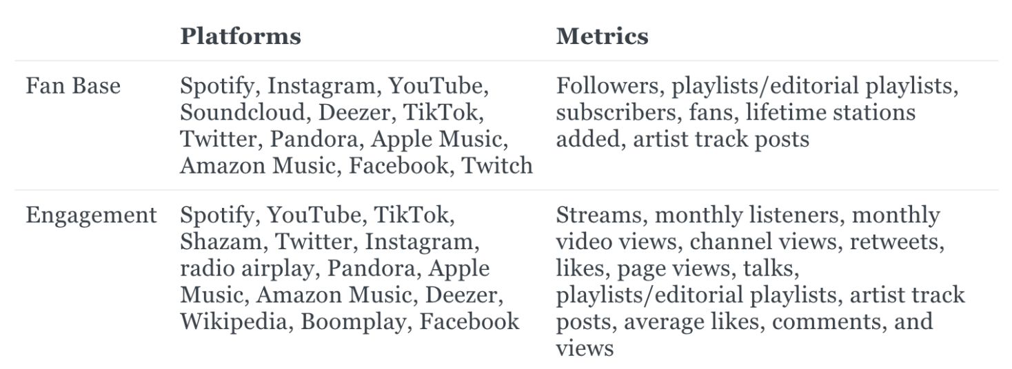 As our database grows and different music and social media platforms shift in popularity with artists and their audiences, CPP is also prone to further changes to reflect such movement. These updates are key in our goal to maintain accurate and reliable metrics as well as keep users up to date with the constant movement of data in the music industry.