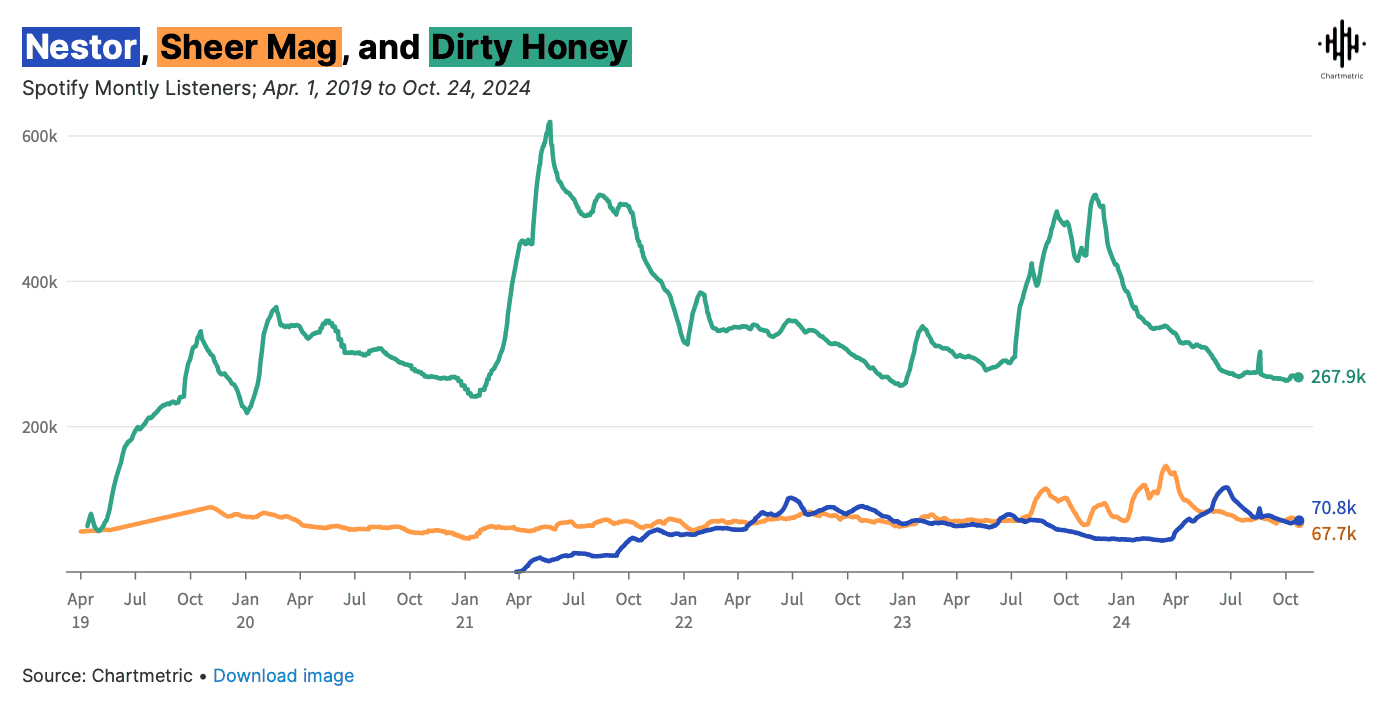 The Cruel Intentions are one of several outfits who’ve significantly benefited from Gunn’s exposure. “Jawbreaker,” “Borderline Crazy,” and “Sick Adrenaline” have all passed 1 million Spotify plays since featuring on the show and the official Peacemaker playlist (147k likes). Their monthly listenership, meanwhile, has shot up from 9k to 38k, and they’ve received a million more YouTube channel views, too.