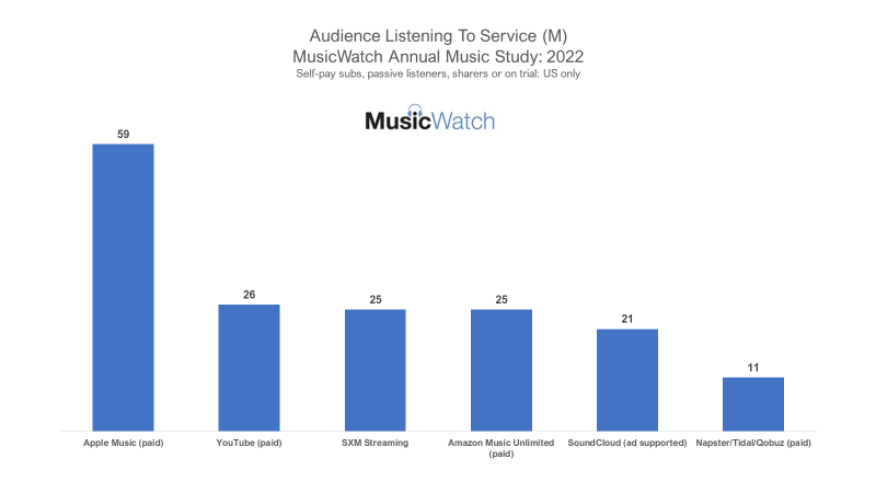 *Listeners estimates are based on MusicWatch projections from its Annual Music Study completed January 2023. Listeners include the spectrum of a service’s audience; self-pay subscribers, those with family plan access, those who share account log-ins, passive listeners and those on a trial to the service.