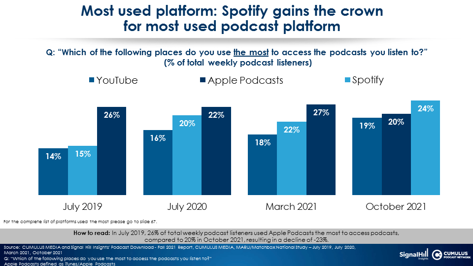 Earlier in the month, Cumulus and Signal Hill Insights presented a new research studyrevealing that Spotify is now the #1 destination for podcast fans, passing both Apple and YouTube. Their data matches other research conducted this past year.