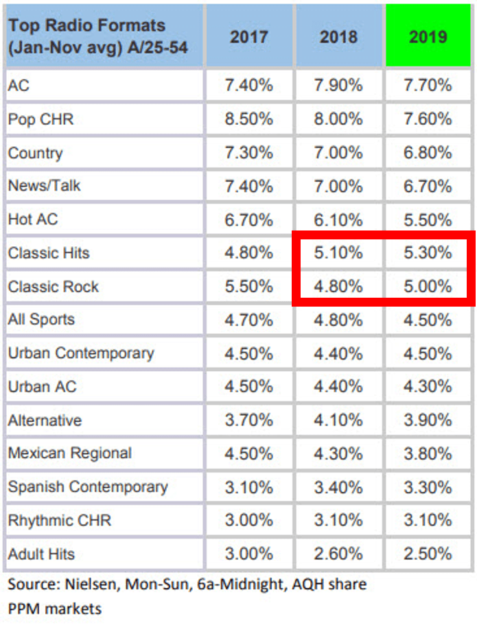 Well, here we are 35 years later, and the format is going strong. Earlier in the week, Inside Radio and other trades printed format trends for 2019 from the Nielsen data bank. While nearly every format has been heading south, Classic Rock and Classic Hits have generally been headed in the opposite direction. And both are finishing the year in a strong position in many of the nation’s largest and most competitive markets in the demographic – 25-54 Adults – radio cares most about: