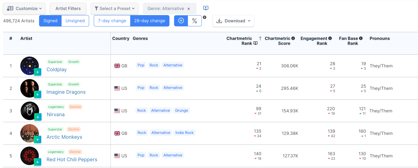 In every era, the youth have played a lead role in deciding what pop culture’s “next big thing” will be. It’s really no surprise, then, that artists who once found their audience through Tumblr gifs are now some of the industry’s biggest players. Using the Artist Filters on our Artists List, we find that the Top 5 Alternative artists according to Chartmetric Artist Rank is dominated by Tumblr Music—especially when the audience is limited to the ages most influenced by 2010s Tumblr, i.e., 18-24-year-olds.
