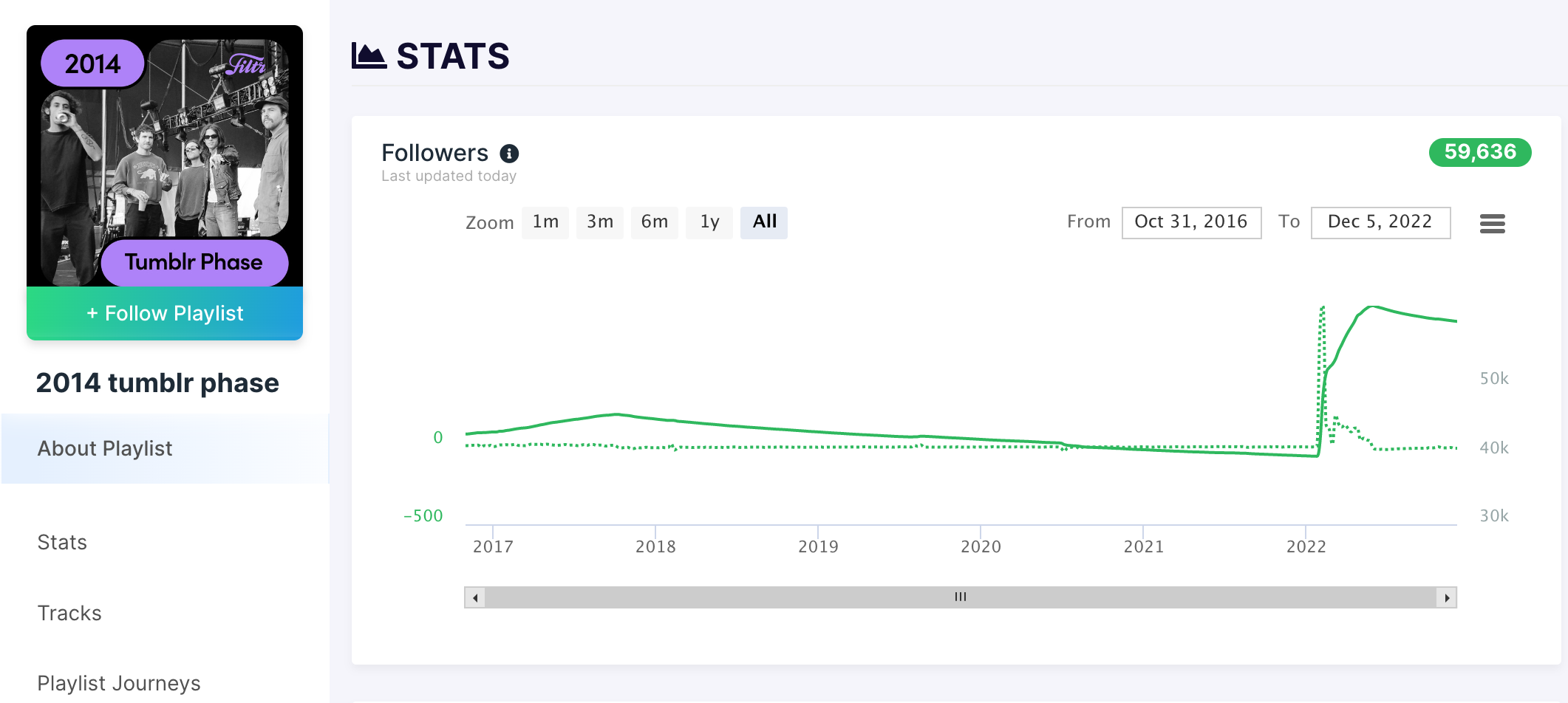 Almost a decade has passed since Tumblr’s 2010s reign, but the American microblogging platform reported 73 million accounts in 2013 before it was acquired by Yahoo. Today, nearly 50 percent of today’s Tumblr user base hails from the United States, and that share was likely even larger at the platform’s height. Using Filtr’s 2014 tumblr phase playlist as a reference, it’s evident that the majority of artists from this selection also hail from the United States. Given the app’s user base, we can assume that the US-based platform favored domestic artists, presenting them with an optimal environment for growing their audience and engagement.