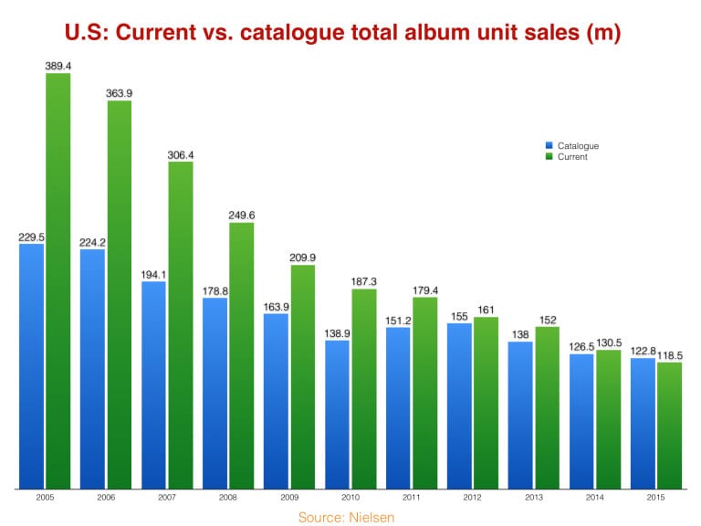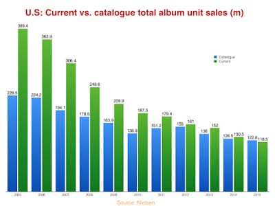 Guest Post by Bobby Owsinski on Music 3.0According to the latest Nielsen report on the music business of 2015, catalog albums (defined as any album more than 18 months old) outsold newly released albums, which is the first time that's ever happened. That's even despite the huge sales numbers of Adele's 25.In 2015, catalog albums sold 122.8 million units, while new albums sold 118.5 million, a drop of more than 9% from the previous year. Adele amount for around 7.5 million of those 118.5 million, which means that the figures would have been really lopsided had she waited until this year to release 25.