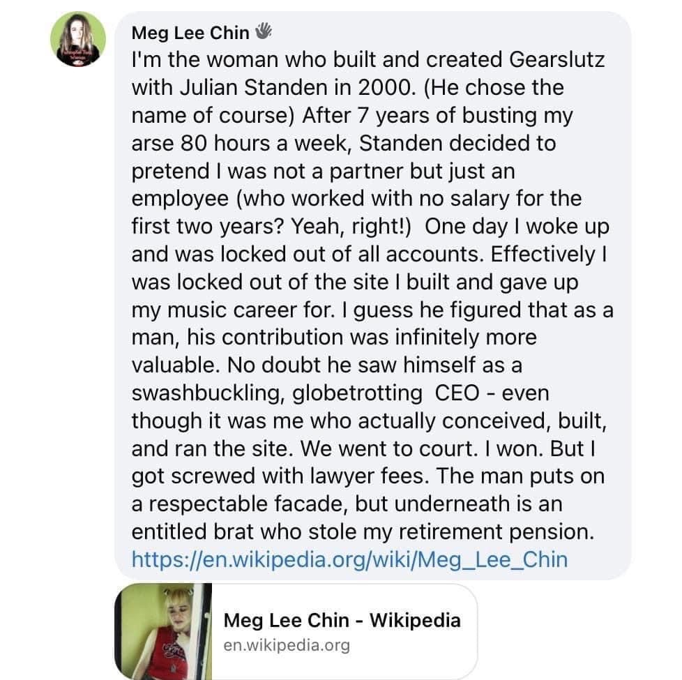 Meg Lee Chin publicly commented on the petition and spoke out on social media. She posted her comment, outlining her previous role as the founding partner of Gearslutz with Standen back in 2000 and recounted her experience of waking up one day to discover she had been locked out of all the accounts relating to the site and the business.