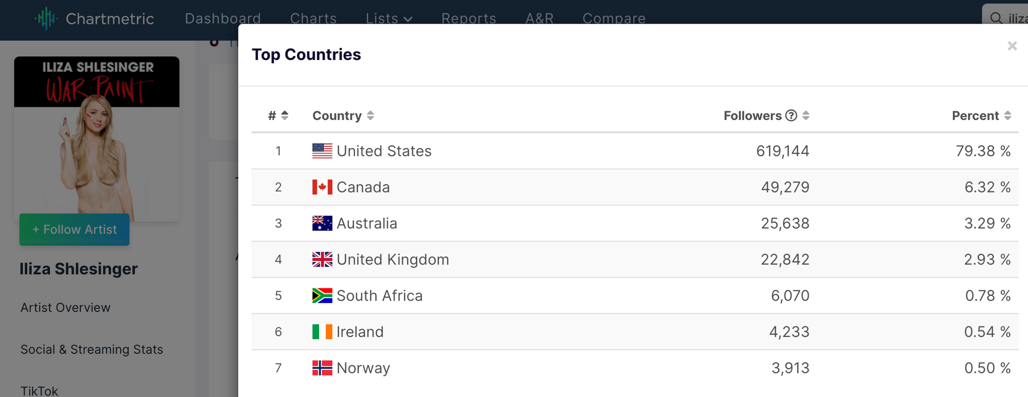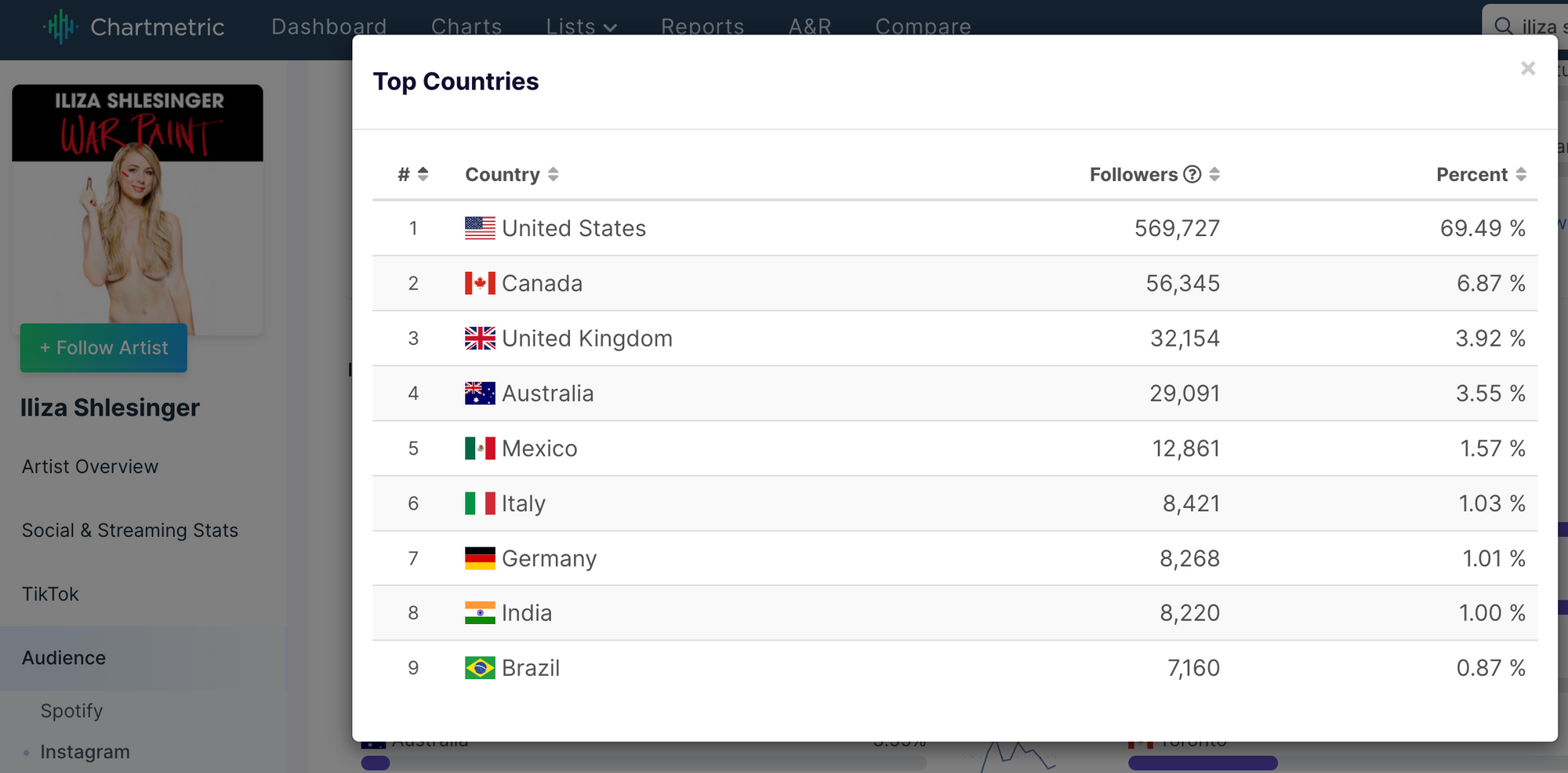 Looking at Iliza Shlesinger’s TikTok account (780K followers at the time of writing), it’s clear the Anglosphere countries of US, UK, Canada, and Australia are all great places for her to work in, especially when combined with her Instagram follower fanbase (819K). It’s always good to corroborate insights across platforms.