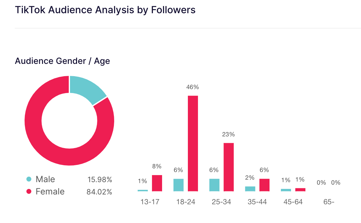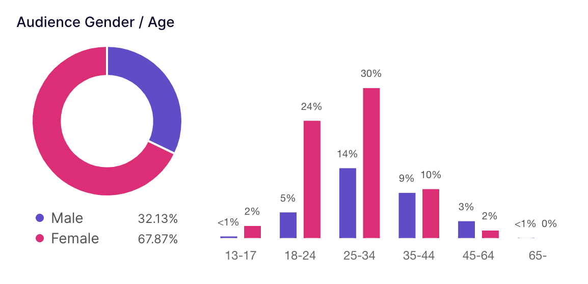 Cross-referencing platforms never hurts because you are adjusting for the platform’s own user base, which has its own skew independent of the talent in question. At first glance, you’d guess Shlesinger’s main TikTok fanbase is 18-24/Gen-Z women. But looking at her Instagram audience, her overall “in-real-life” audience at least includes the 25-34 age range as well (even there, Instagram skews towards older millennials). This doesn’t mean she doesn’t have any older, or male, fans, but it does contextualize her audience a bit more (which is useful in itself for native digital marketing campaigns).