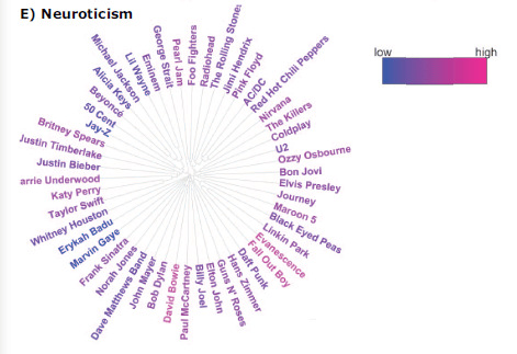 Finally, “neuroticism” was more likely associated with metal, hard rock, and alternative artists, and included Ozzy Osbourne, Nirvana, the Killers, and Fall Out Boy. In fact, the “Wheel of Neuroticism” is below – artists that fall into this group are toward the red-violet zone: