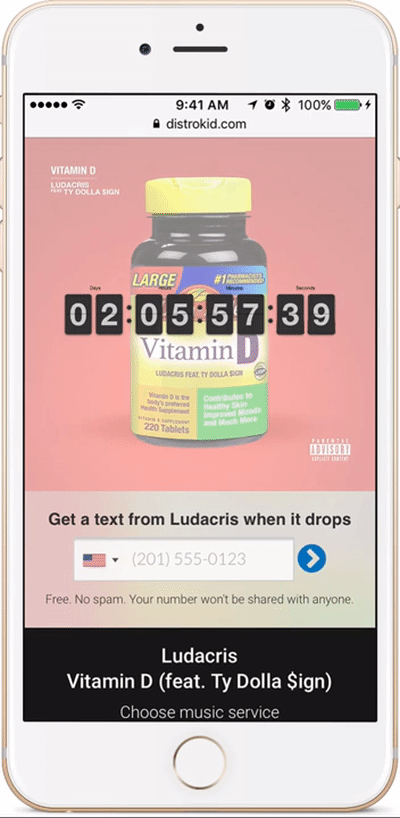 - Collect mobile numbers — We’ll give you a page (like this) that you can share everywhere. It contains a countdown timer to your release date. And it collects the mobile phone numbers of your fans.