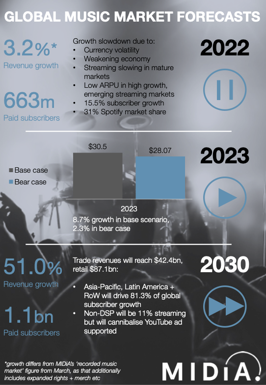That’s the good news. 2022, though, was an anomalous year, and 2023 is shaping up to be similarly volatile. Shaped as it is, by a cost-of-living crisis, soaring interest rates, economic slowdown, a softening ad market, global food and energy shortages, and a war in Europe. When we built the 2022 edition, we knew these factors might disrupt the music industry’s trajectory, so we built both a base case and bear case forecast. Our base case proved to be too optimistic ($30.7 billion) while our bear case ($28.3 billion) proved to be depressingly precise (just 0.8% above the actual figure of $28.1 billion).