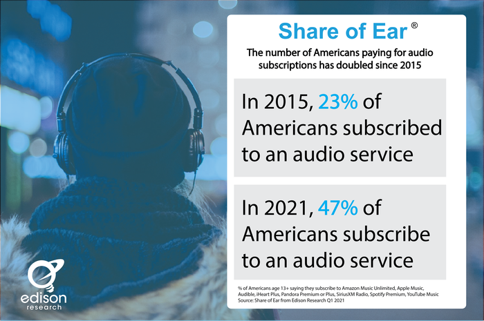 47% of Americans subscribe to an audio service, up from 23% in 2015.
