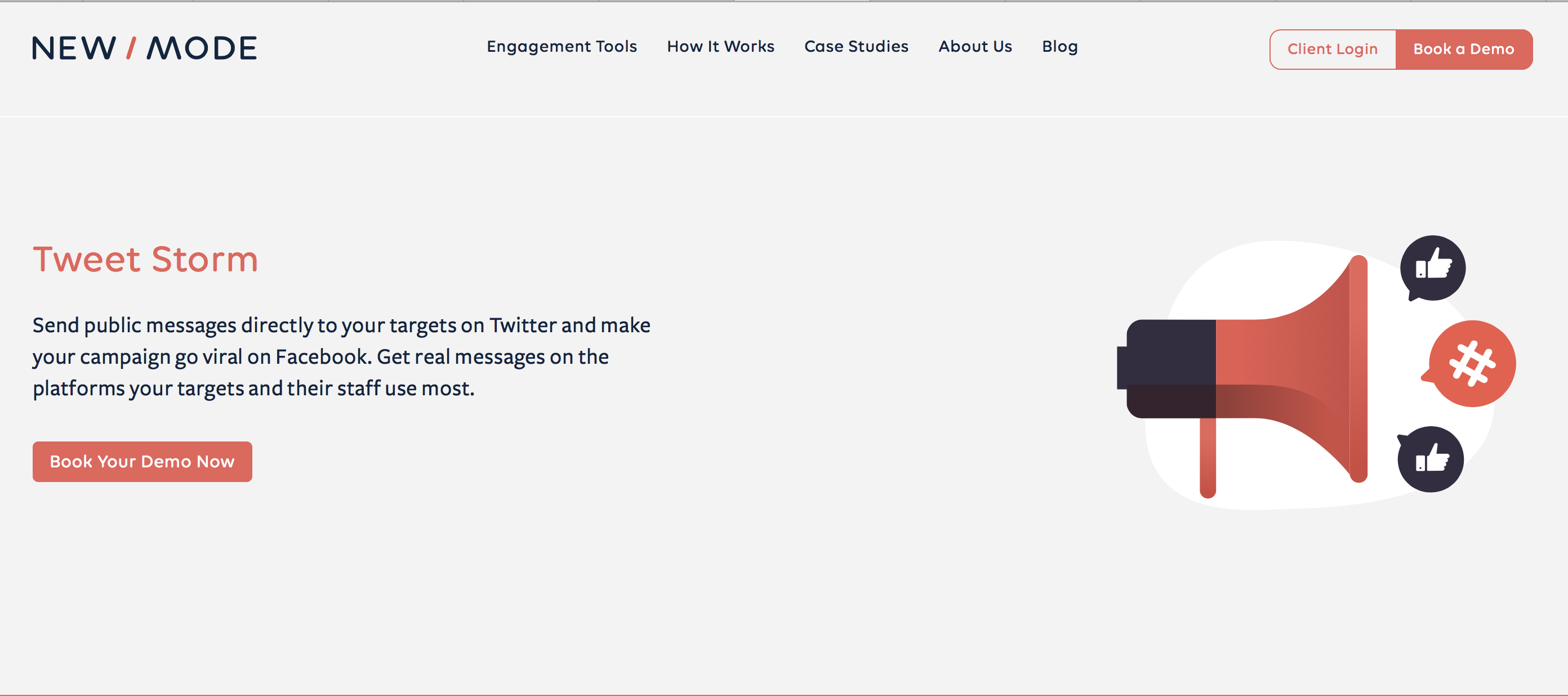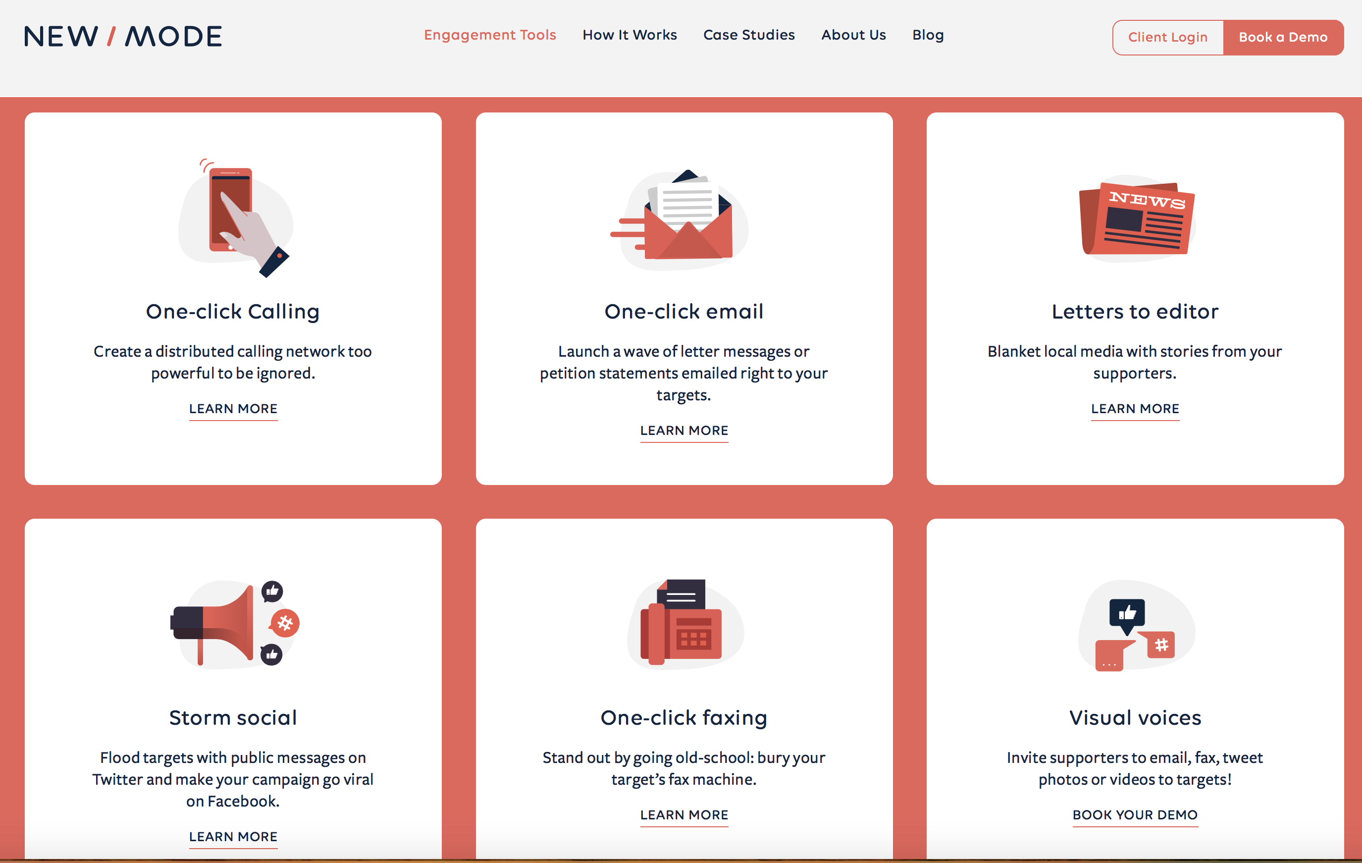 But doesn’t Google have like a zillion academics, think tanks and astroturf groups already doing that for them? Yes. That is true. So what is so interesting about OpenMedia.org? It’s how they go about supporting Google and other silicon valley companies. They specialize in creating “grassroots” campaigns. Only these aren’t really grassroots campaigns. They are pure astroturf. Their campaigns make heavy use of automated tools that allow a single person to repeatedly spam targets with tweets, emails, robo-calls, robo-faxes and even automated letters! How do they do that?Meet New/Mode Purveyors of the Finest Democracy Hacking Tools.