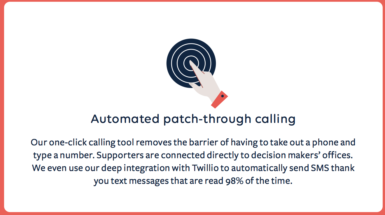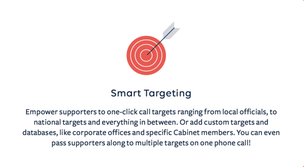 Let’s look at one click calling. Pure clicktivist nonsense. I tested this out a while back. A user can put in any postal code. No one checks. I put in a postal code for a rural city in the northern plains of the US and I was connected to the office of someone who was not my congressman. I was scripted to behave as if I was a constituent.