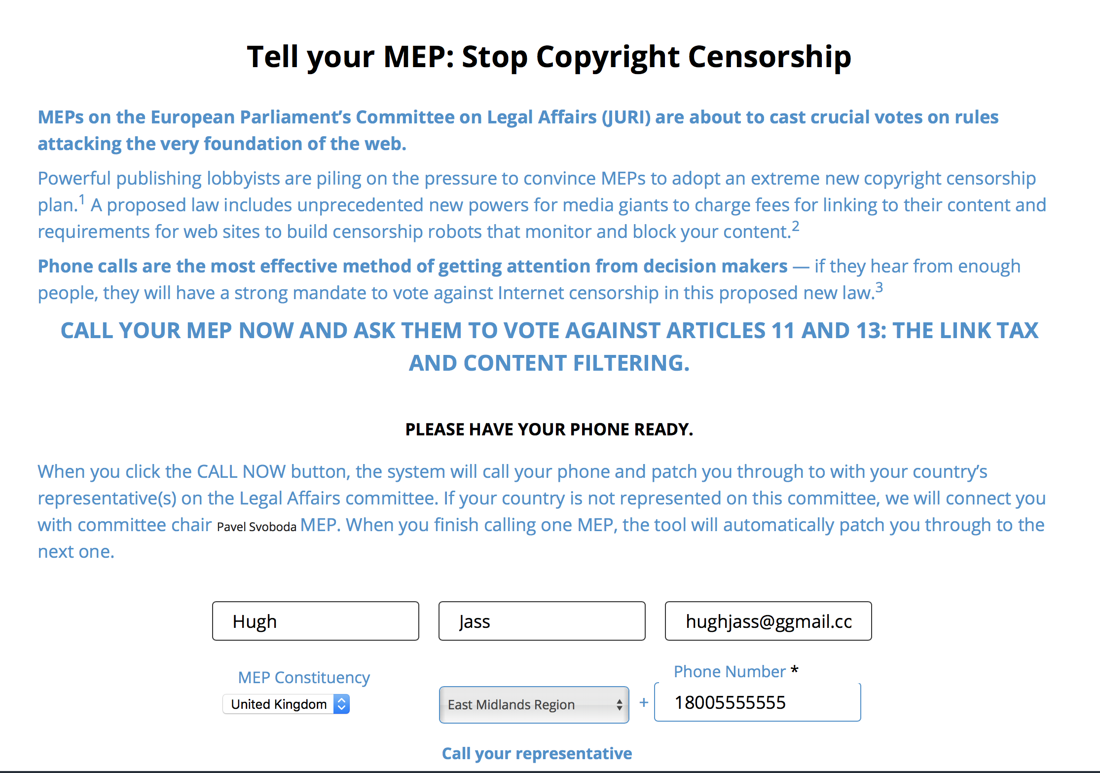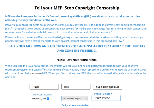 During the #DeleteArticle13 campaign I was able to dial UK MEPs using New/Modes tool. Even though I was using a US phone number! NewMode and OpenMedia didn’t seem to care. Why should they? Any cybermob is a good mob right?