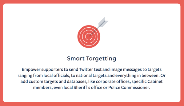 Here’s what they do. One-click calling. One-click email. One-click faxing. Fairly predictable. Storm social? hmm like the sock puppet tweet storm we saw directed at the MEPs last month? Letters to the editor? WTF? Automated letters to editors? (more on that in a minute).