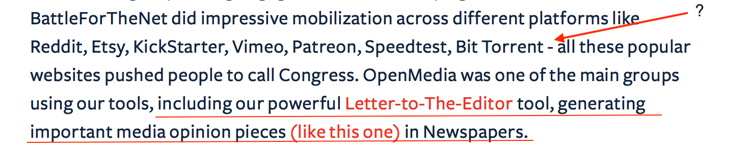 The US Federal Communications Commission was targeted by New/Mode tools last year:The Trans Pacific Partnership trade agreement was derailed largely due to disinformation spread with this Open Media New Mode enabled tool. Here is the OpenMedia.org “cloned” website that first deployed the tools:Original opposition was based on intellectual property provisions, but Trump (and to a lesser extent Sanders) hijacked the movement and turned it into a jobs issue. (You see what happens Larry when you find a stranger in the Alps?)