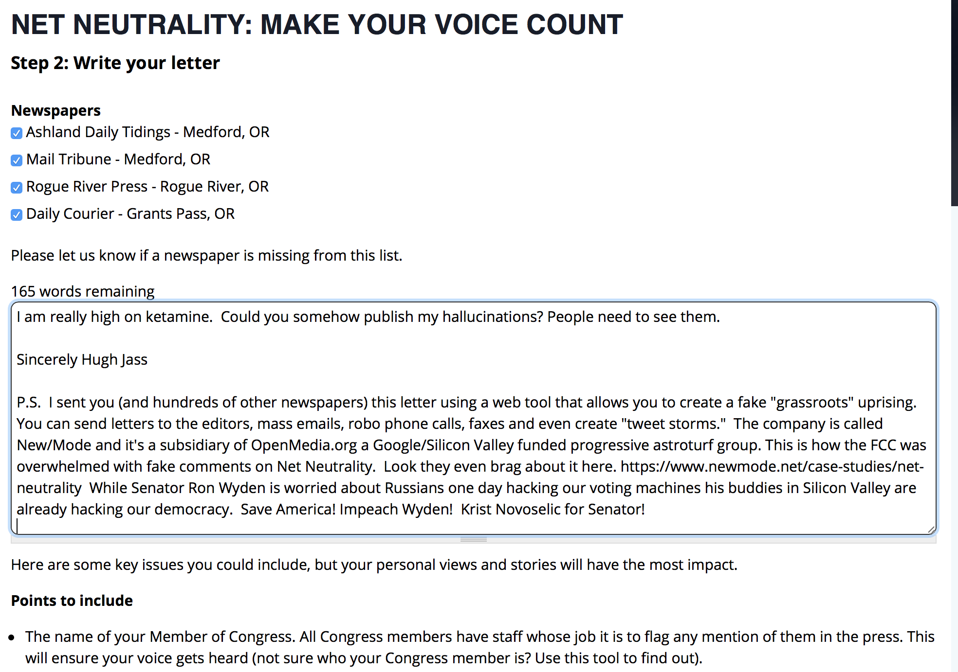 Just to demonstrate how fucked up this is, I repurposed the Net Neutrality letter to the editor. I replaced their text with my own and sent the following letter to every small town newspaper in Oregon. It took maybe five minutes? The joke in the letter is that Sen Ron Wyden of Oregon has proposed a bill to prevent hacking of federal elections by mandating paper ballots. The problem is that Wyden clearly does not have a clue as to how our democracies will be hacked. Our democracies will be hacked by hybrid information warfare techniques. NOT ballot tampering. The creation of fake grassroot movements and disinformation is what will kill our democracy. OpenMedia.org and New/Mode are already deploying the tools that will kill our democracy. But given the fact Wyden is sometimes referred to as “The Senator from Google” don’t expect him to do anything about it. (Also Google and Oregon? See here)Oh and Krist Novoselic is the former bass player of Nirvana. And he does have political aspirations. See his bookCan’t be any worse than Senator Ron “Hedge Fund In My Basement” Wyden.