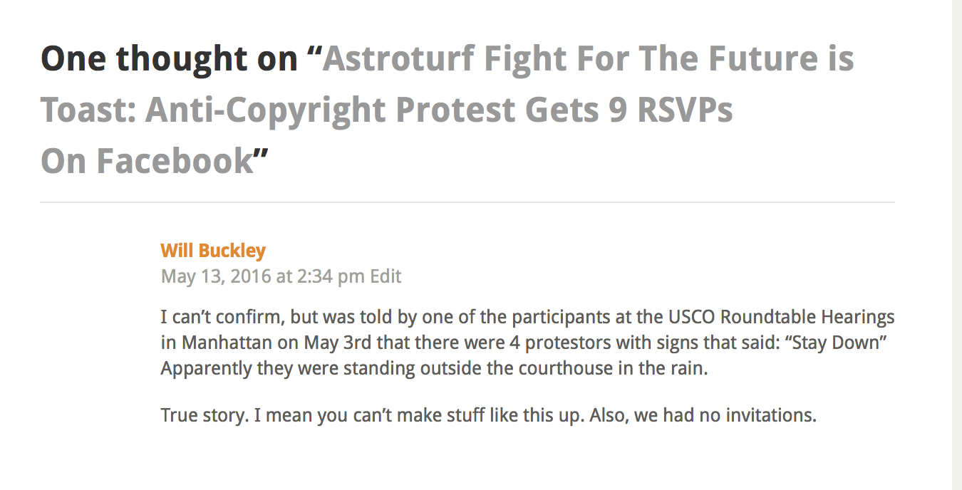 As we have noted repeatedly on the Trichordist, when Google funded/directed astroturf groups that use the New/Mode tools then try to turn their cyber-brownshirts into boots on the ground very few (if any) people show up.In 2016 Fight For The Future launched a campaign against the US Copyright Office consultations on copyright reform. Fight or the Future claimed to have crashed the Regulations.gov website with New/Mode tool. (Is this something to brag about?) Fight for the Future claimed it was because tens of thousands of folks responded to their online campaign and overwhelmed the regulations.gov portal to comment on US Copyright Office consultations. At the same time Fight For The Future organized a rally. However only 4 people showed up to protest in person. Judging by signs all four were pro-copyright. Apparently they showed up to oppose the non-existent Fight For The Future protestors. Doesn’t make sense. A group that can get tens of thousands of folks to leave comments on wonky federal regulations but they can’t get anyone show up for a protest?Similarly there are only 37 individuals in the photo of the “huge” white house rally to keep title two net neutrality at FCC. This was also organized by Fight For The Future. So the online campaign generated millions of comments, emails and phone calls and 37 people show up to protest at the White House? This does not pass the smell test.Over in Europe reports indicate something similar happened. The biggest #DeleteArt13 rally in Berlin had less than 150 participants. Where are all the millions of folks who sent tweets, emails and phone calls to EU parliamentarians?The simplest explanation is that most of the online protestors don’t really exist.Fake, fake fake. Pure fakery.It Gets Worse: New/Mode Hacks Print Media