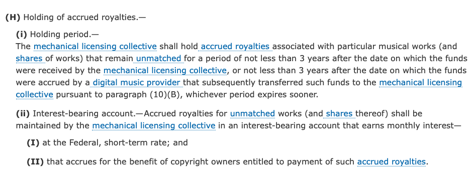 And remember–all of the interest “accrues for the benefit of copyright owners entitled to payment of such accrued royalties.” So the MLC collects and pays the interest money but cannot touch it. That also doesn’t mean they can’t hold the money in an account at City National Bank in Nashville that pays a higher interest rate and keep that delta. I don’t know that they are working that spread, but remember that what makes MLC different from every other collecting society in the world is that the users of the compulsory license pays the MLC’s operating costs and not the songwriters. Or at least that’s how it was sold.