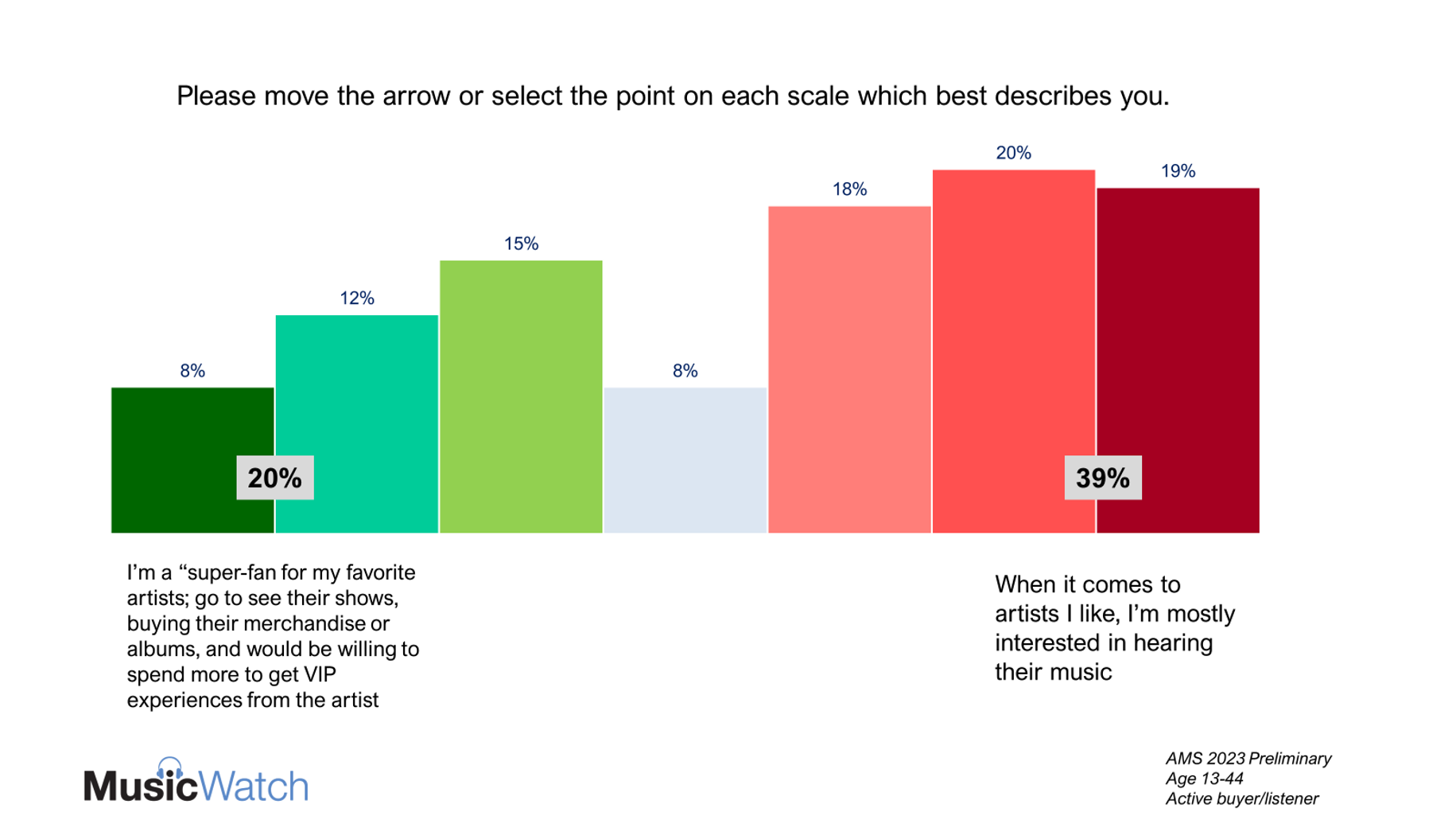 MusicWatch examined several elements of fanship in our soon to be released Annual Music Study. The area is indeed untapped. Looking at 13–44-year-olds who listen to or buy music, only 3 percent purchased a VIP Package during 2023. These VIP packages are specially created by artists for fans, and could include ticket bundles, exclusive or special release CDs or Vinyl, a merch bundle, or something similar. Only 10 percent of these fans are interested in tipping, direct to artist payments or crowdfunding for artists. We asked respondents in the Annual Music Study to describe themselves across a series of music related questions, including likelihood to engage in superfan experiences. The results, across a seven-point scale, are shown below: