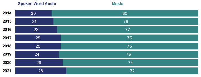 - Spoken Word’s share of audio listening has increased by 40% over the last seven years; 8% this year