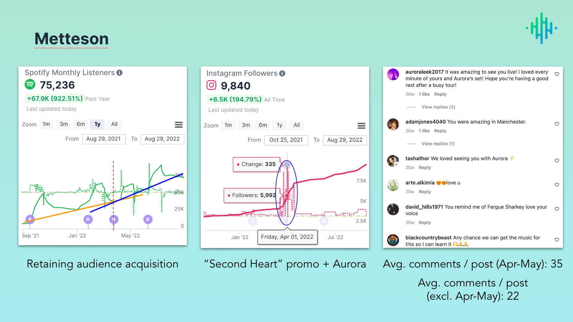 Metteson’s release of the single “Second Heart” around the same time he supported AURORA’s shows also meant both his existing fans and potential new audiences had something to be excited about—new music. With post-AURORA support and “Second Heart” promotion, Metteson’s Instagram followers increased 76% percent from 4.3K+ to 7.5K+. His social media engagement also went up significantly during this period to an average of 35 comments per post in April and May with a very positive sentiment, a 59 percent increase compared to the rest of the year’s average of 22 comments per post.