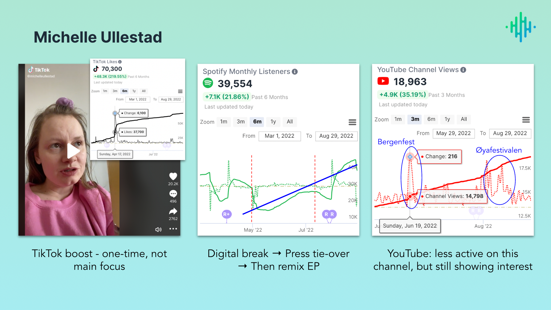 “Being able to analyze data for a specific artist project over a longer time period together with Chartmetric, and by using their platform as analysis tool, was extremely insightful to see how events (release of music, concert, press coverage, social media post) was received by listeners/fans and how the engagement was increasing/decreasing, and use the information towards how to react to the data. I would say that it’s all about having the access to the data, but also prioritize as a label or management team to spend some time during your week on analyzing the data, because it can give insightful information for the benefit of pushing your project further. You can either work in line with the data, because the response/engagement is in line with your strategy or you can work towards it. It can be a tool of seeing if a strategy is working or getting the response you predict, or a way to get insight or new knowledge of new ways to go along with a project that you hadn’t predicted without seeing the data.” – Mathilde Orlien, Michelle Ullestad’s Manager