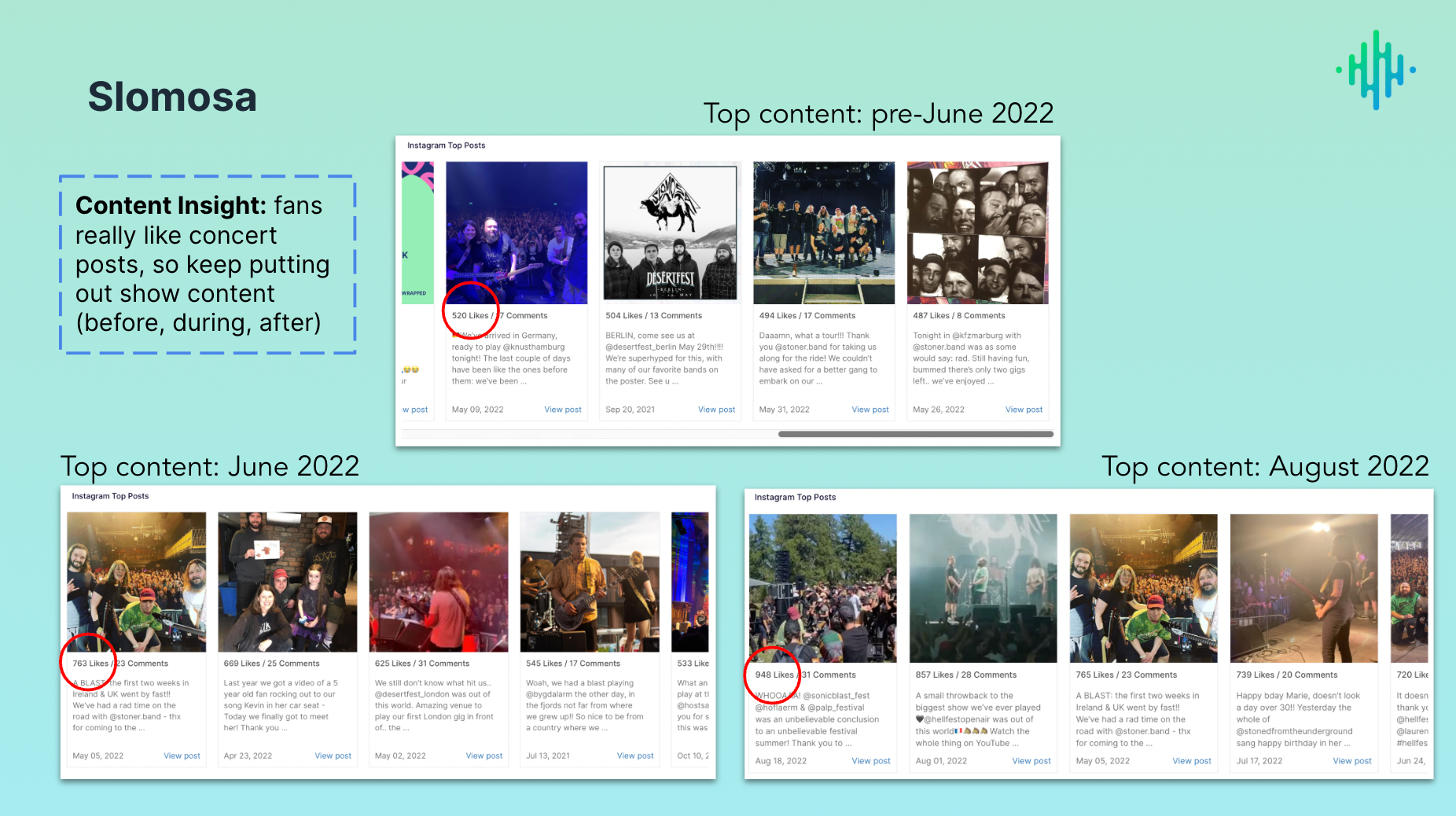 From the beginning, it was clear that we needed to figure out how Slomosa could connect with fans through social media in a way that wasn’t disruptive to the band’s touring schedule. Going through their Instagram Top Posts, we noticed that most were pictures from concerts they’d played. This was content that they were going to create on tour anyway, so we decided to lean into this and do more show posts. From June to August, they quickly racked up likes on the platform. In fact, their top post now has almost 1000 likes, more than double their average likes per post.