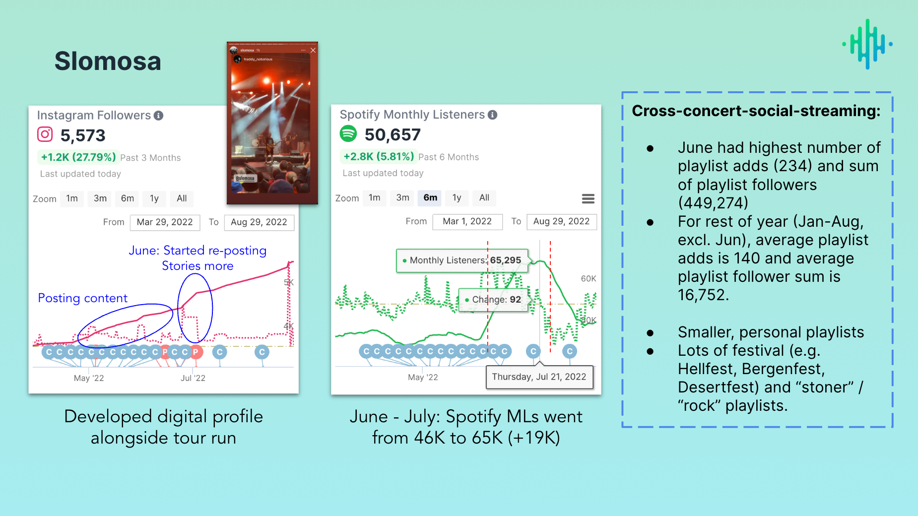 As Berdous developed Slomosa’s Instagram profile alongside their tour run, we also began seeing a steady increase in followers. In June, he started re-posting fans’ stories on the band’s account, generating another uptick in their fanbase. As their digital footprint grew and the band continued to play shows across Europe, it seemed that their work online and offline was starting to cross platforms and pay off in the form of listeners and playlisting on Spotify. It’s difficult to say for sure because we don’t have every single data point to form a complete map of the exact journey of fan interest from one medium to another, but from June to July, Slomosa saw their Spotify Monthly Listeners jump from 46K+ to 65K+, a significant 42 percent increase in the space of just two months.
