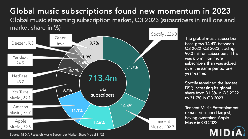 As of Q3 2023, there were 713.4 million music subscribers globally, which was 90 million up on the 623.4 million one year earlier in Q3 2022. This matters for two reasons: