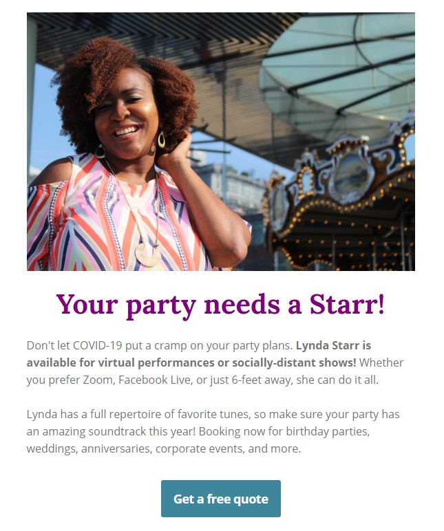 It also doesn’t hurt to reach out to past clients letting them know that you’re available for virtual services. As event planners begin thinking about upcoming parties, be the first one to let them know that you’re ready to take on those bookings! Put together a little announcement email promoting your new services. Be sure to put a call-to-action button or link to give people a chance to request a quote.