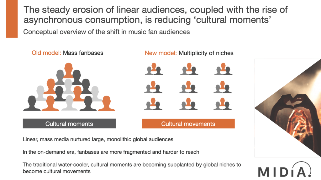 In 2019, MIDiA wrote that “Niche is the new mainstream”, that the water cooler moments of the linear era were being replaced by cultural moments. Audiences are in different places at different times, with algorithms delivering them different personalised content. Concepts, such as ‘song of the summer’, are becoming different for everyone. Each listener has their own song of the summer. In the era of fragmented fandom, water cooler moments across the masses, where everyone heard the song on the radio at the same time, are replaced by smaller groups of people finding pockets of likeminded fans across the world.
