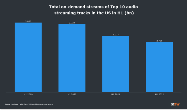 Indeed, the fragmentation of listening that streaming is pushing consumption towards the middle, away from the superstars, as Music Business Worldwide’s Luminate chart for streams of the US top-10 tracks shows.