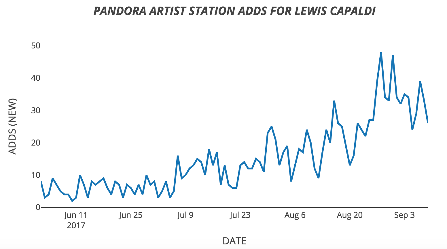 LA-based pop singer-songwriter Glenn Travis is feeling the love. In one month, he’s seeded over 3,600 artist station adds on Pandora, added around 3,800 Twitter followers, and racked up over 1.2 million YouTube views. That’s even more notable when you consider that last month he only added 450 Twitter followers and about 100,000 YouTube views.Inas X, Lewis Capaldi
