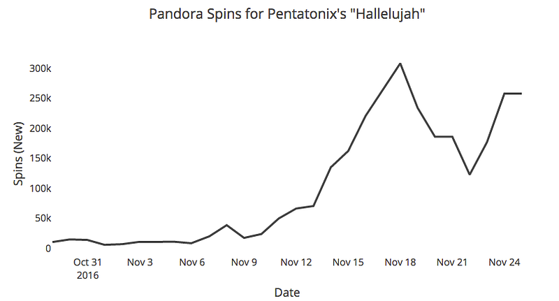 In the three weeks since Leonard Cohen’s death at 82, Pandora listeners have been religiously spinning Hallelujah — both Cohen’s original version and its many covers. The original has seen a month-on-month 318.4% increase in Spins and a 1,068.3% increase in Track Station Adds. Two weeks before his death, a cappella fivesome Pentatonix just happened to release their own cover of for their album A Pentatonix Christmas. It’s already racked up over 1.4 million weekly Spins, debuting this week at #69.