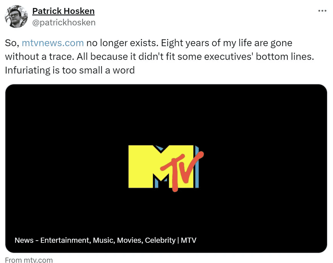 It’s part of a broader disdain for journalism by those with wealth and power, and sends a very clear message: your work is so unimportant that we can’t be bothered to do the bare minimum to preserve it. It’s so unimportant, we’re not going to even spend a relative pittance to archive it. We’re not even going to give you a heads’ up so that you can archive it yourself.
