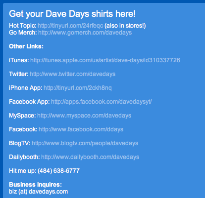 He racked up so many views and fans that eventually the REAL Miley actually appeared in one of his videos. It took over 3 years (first video was 2007), but Dave Days had “made it.” Today he has nearly 1.5 million subscribers on YouTube, over 170,000 Twitter followers, 232,000 Facebook fans, 62,000 DailyBooth followers, an iPhone app, and a Facebook app. The channels and the audience are starting to yield some revenue, too. A video he did for Pop Tarts is up to 280,000 views, and he’s pushing merchandise like t-shirts on his YouTube page.