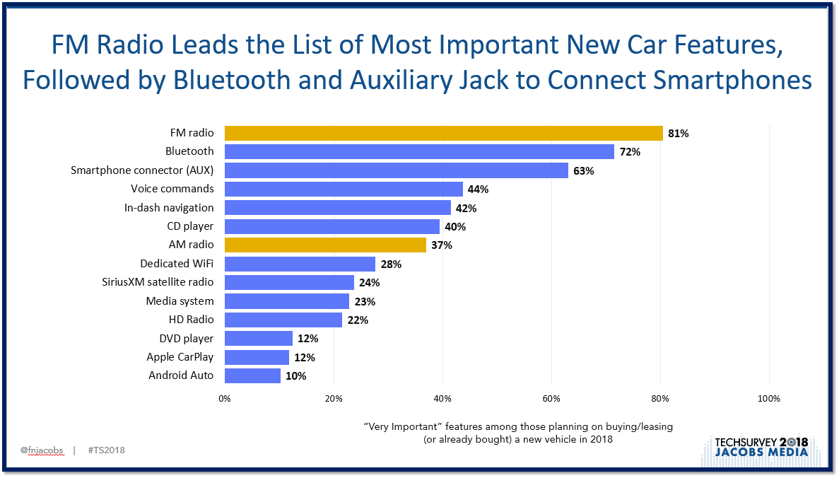 Guest post by Fred Jacobs of Jacobs MediaI know I may sound like a relic from another era, but chances are if you’re a Baby Boomer (or gasp – even older), you were inspired by AM radio as a kid growing up whether it was in a big city or a small town. If you’re a member of a younger generation, you may not even know that AM – or amplitude modulation – has a magic power. At night when the clouds are just right, AM signals have the ability to “skip” across geography, unlike frequency modulation (FM) which is line of sight. “Clear channel” stations had an even easier time being heard beyond their metro confines – often covering many states during the nighttime hours.Many of us radio veterans remember those nights, lying in bed, where your trusty bedside AM clock radio pulled in signals from all over the U.S. As a boy in Detroit and not especially well-traveled, I learned how to pronounced Des Plaines (Des-planes) and Touhy (2E) by listening to Chicago radio stations like WBBM and WLS. Tuning in KYW in Philly (which came in “like it was next door”), I learned how to spell the quirky town of Conshohocken from listening to Phillips Ford commercials. It was from a jingle that got in your head (CON-SHO-HO-CKEN). At least, it got in mine.It didn’t matter if you lived in Dallas or Des Moines, or a small town in Delaware – you were able to pick up big AM radio stations from faraway. And if you talk to today’s broadcasters on the other side of 50, many will tell you their careers were likely inspired by these booming, exciting blowtorches on AM radio that provided a soundtrack for our teens.AM radio was where we first heard the Beatles, the Supremes, the Stones, Stevie Wonder, and even the Doors. Big AM Top 40 stations of the day – KHJ, WABC, CKLW, WLS – played all these cool rock songs, right next to Herb Alpert & the Tijuana Brass, Elvis, Bobby “Boris” Pickett, and the Singing Nun. And even though the fidelity of amplitude modulation is obviously technically inferior to that of FM, there was something very different and even romantic about hearing all those songs first on AM radio. All the big recording studios used AM radio-sounding speakers as they worked on their final mixes, knowing that’s where the music would first be exposed. They may have sounded cleaner years later on FM, but they sounded bigger on AM.So, when Steve Goldstein posted a Wall Street Journal story the other day – “Why Nighttime Is The Right TIme For The Great American Road Trip” by Dan Neil – it sparked a reaction from lots of old radio guys on Facebook. One after another chimed in with call letters, personalities, and faraway cities that charmed them over AM radio during the evening hours decades ago.But alas, there’s nothing very romantic about AM radio these days. While broadcasters did their best to salvage these facilities, mostly by switching to spoken word formats, there are fewer and fewer AM stations still thriving. And unlike those good old days where many AM stations were in hot pursuit of one another, there are just a handful still operating at meaningful competitive levels. Even the great stations feel a lot like high-end department stores anchoring malls on the poor side of town.And so in this year’s Techsurvey, our new research director, Jason Hollins, came up with a fascinating idea to gain a better understanding of AM radio’s continued relevance. Over the years, we’ve identified new car buyers (or those in the market for a new vehicle). We then give them a list of in-car media features, and ask them to tell us which are most important to them.We’ve always expressed broadcast radio as “AM/FM.” And it has always ended up at the top of drivers’ wish lists – ahead of connectivity features like Bluetooth, Wi-FI, and Apple CarPlay. It’s not just our radio-centric Techsurvey that shows broadcast radio ranking above newer features – everyone’s research reinforces its value at these high levels.So, in our new Techsurvey 2018, we separated AM and FM radio for this question. And the results are perhaps predictable: