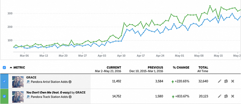Guest Post by Liv Buli on Next Big SoundThere are just a few short days until Memorial Day weekend is upon us, and the summer season has officially began. That means it’s time for predictions about what songs will dominate the airwaves as we roll out the beach towels and sunblock. Looking at Pandora spins and station adds, as well as social data across all major platforms, we determined which songs are on track to be the top ten songs of the summer. From major hits to rising stars, here are the hits you will probably be tired of by the time September rolls around.1. Desiigner’s “Panda”Ok, so the track might have gotten a kick start from Kanye’s nod on The Life Of Pablo, but by now Desiigner has come into his own. After climbing the top of the Billboard Hot 100 in April, he was able to fend off both Beyoncé and Drake in the midst of a flurry of press coverage surrounding their high profile album releases. You might think that the track has already reached it’s shelf-life, but the ones with staying power tend to have a slow and steady climb, and “Panda” is still climbing . The first two weeks the track was on Pandora back in February it spun on average 45,000 times a day. Over the past two weeks that number was up to more than a million.Slow and steady wins the race. This is what the trajectory of a hit song with staying power from an unknown artist typically looks like. Graphic courtesy of Next Big Sound.2. Drake’s “One Dance” (feat. Wiz Kid and Kyla)Yup, Drake is back. And if you caught his Saturday Night Live performance, you’ll know he has no plans to retire the tennis racket dance for this album.Views has already been an unprecedented success in terms of overall stream counts, and now you can expect lead single “One Dance” to appear on every summer soundtrack worth spinning. In a little more than a month, the track has already racked up close to 40 million plays on Pandora, as well as more than 165,000 track station adds.3. Rihanna’s “Needed Me”Rihanna is not done releasing hits off Anti, and now that “Needed Me” has been introduced into the rotation we can expect to hear it until it sounds as indecipherable in our minds as the rest of the lyrics on “Work.” Having already hit more than 50 million plays in total, spins for the track are increasing week over week. In March, she was knocking back on average 1.6 million spins a week for “Needed Me.” In April that number was closer to 4 million. And last week it spun about 5.6 million times.Andrew Taggart and Alex Pall of The Chainsmokers perform at JEWEL Nightclub at ARIA Resort & Casino. (Photo by Isaac Brekken/Getty Images for GREY GOOSE Vodka)4. The Chainsmoker’s “Don’t Let Me Down” (feat. Daya)Remember when The Chainsmokers taught us how to take a self-indulgent selfie and set the internet on fire a few years back? Well they’re back for more and have teamed up with rising star Daya on inescapable earworm “Don’t Let Me Down.” You’ve probably heard it 20 times already, but expect to hear it another 2,000 times before September rolls around (if you live on planet earth that is). Why? Because it’s really good. And because more and more people are listening to it. Counting about 45 million spins on Pandora in total at this point, the track has gone from an average of of 20,000 spins a day its first week on the platform to more than 800,000 a day over the past week.5. Meghan Trainor’s “No”No, Miss Trainor is not taking a break, thank you very much. Following up her 2015 hit album (Title) with a second studio effort (Thank You) a little more than a year later, lead single “No” is already charging up the charts and racking up the spins. The track was an instant hit on Pandora, with more than 5.5 million spins in the first two weeks. Expect the single to stay in rotation as the warm weather rolls in.6. Grace’s “You Don’t Own Me” (feat. G-Eazy)Grace is the up-and-comer on this list. The young Australian (who happens to be siblings with fellow pop prodigy Conrad) released a modern take on Lesley Gore’s “You Don’t Own Me.” And what a move to team up with G-Eazy for this one. The result is a familiar yet avant-garde hit song that will be riding the airwaves all summer. The tipping point for the track was actually late February, when it went from a few hundred spins a day on Pandora to tens of thousands. Since then it has continued to climb at a staggering rate. Last weekend, it topped close to half a million spins in a single day, a feat that is impressive (to say the least) from an artist that is still relatively unknown.While the overall number of station adds for Grace are higher, more stations on Pandora have been seeded with the track since March, than with the artist herself. This speaks to the growing popularity of the song. Graphic courtesy of Next Big Sound.7. Justin Timberlake’s “Can’t Stop The Feeling”Justin Timberlake is in a good mood, and damn if it isn’t infectious. He just dropped his first track in three years (granted The 20/20 Experience was really, really long), and it is unsurprisingly going to be one of the most popular tracks of the season. It has already racked up about 10 million spins on Pandora in less than three weeks, not to mention the fact that in true Justin Timberlake style, the more times you hear it, the more you like it.8. Twenty One Pilots’ “Ride”Blurryface is the album that took Twenty One Pilots from relative (indie) obscurity to mainstream act. As the fifth single off the album, now it’s time for “Ride” to have its moment in the sun as it steadily builds up momentum on streaming services. Since the beginning of April, what was a fairly flat trajectory has started trending upwards, with spin counts and station adds increasing week over week. An average of 75,000 spins a day in February has grown to more than 415,000 so far in the month of May.The end of March/beginning of April was somewhat of a 
