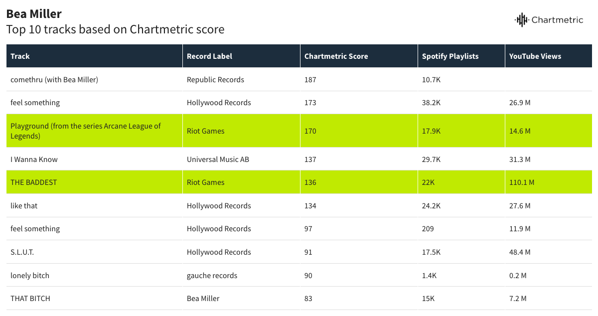 For example, Beer saw her biggest spike in YouTube daily views in the past three years right after the release of “MORE” by K/DA. In the case of Miller, she also saw a spike in her YouTube daily views following the release of “Playground (from the series Arcane League of Legends),” a track that made it to one of the most followed gaming music playlists, Now Loading, curated by Spotify.